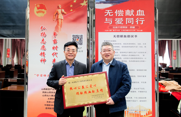 太原市血液中心為航產(chǎn)集團(tuán)頒發(fā)“熱心公益匯愛(ài)心 捐獻(xiàn)熱血獻(xiàn)真情”獎(jiǎng)牌