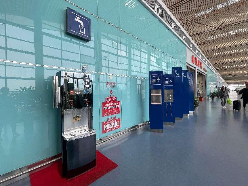 航站樓各區域設有多處直飲水機,旅客可以按需取用冷、熱兩種溫度的飲用水。